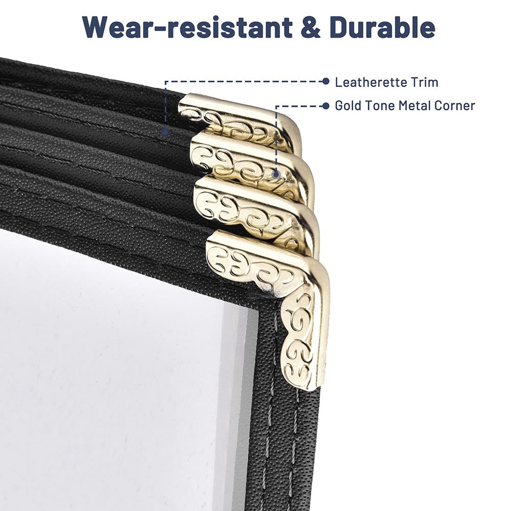 Elevate the presentation of your menu with WeChef 40 Packs of 8 1/2"x11" Menu Cover set! Durable PVC material with soft-touch surfaces is resistant to scratches and stains, while the elegant gold-tone metal corners add a touch of sophistication. Perfect for restaurants, hotels, cafes, bars, and wineries. Buy more and save more!