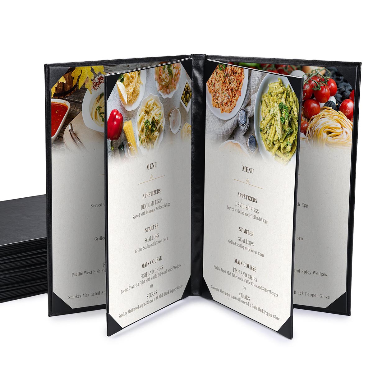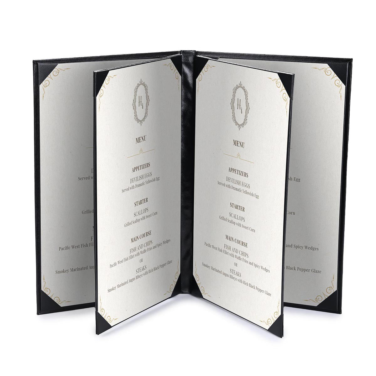 Restaurant menu holders are made of soft faux leather, its premium look and modern design blend well with the ambiance of casual dining establishments, high-end hospitality, cafes and more! It offers protection for up to 6 paper menus, with angled corners on the panels and slots to fix the menu in place. It can be used in bars to present cocktail, wine, and beer menus.