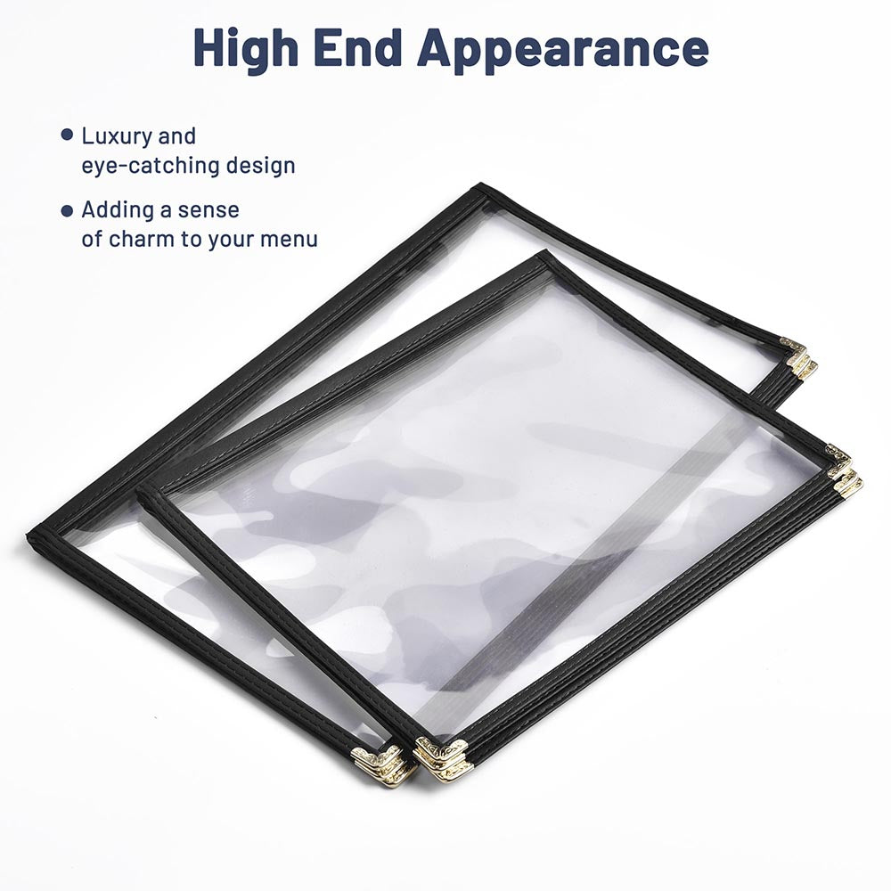 Protect your menus with WeChef 60pcs 8 1/2"x14" Menu Cover! Made with durable & waterproof PVC, these covers are both wear-resistant and easy to clean. The convenient slide-in design makes for quick updates in fast-paced, high-traffic environments like food trucks, Mexican restaurants, cafes and hotels. Keep your menus looking professional and clean with our Menu Cover!
