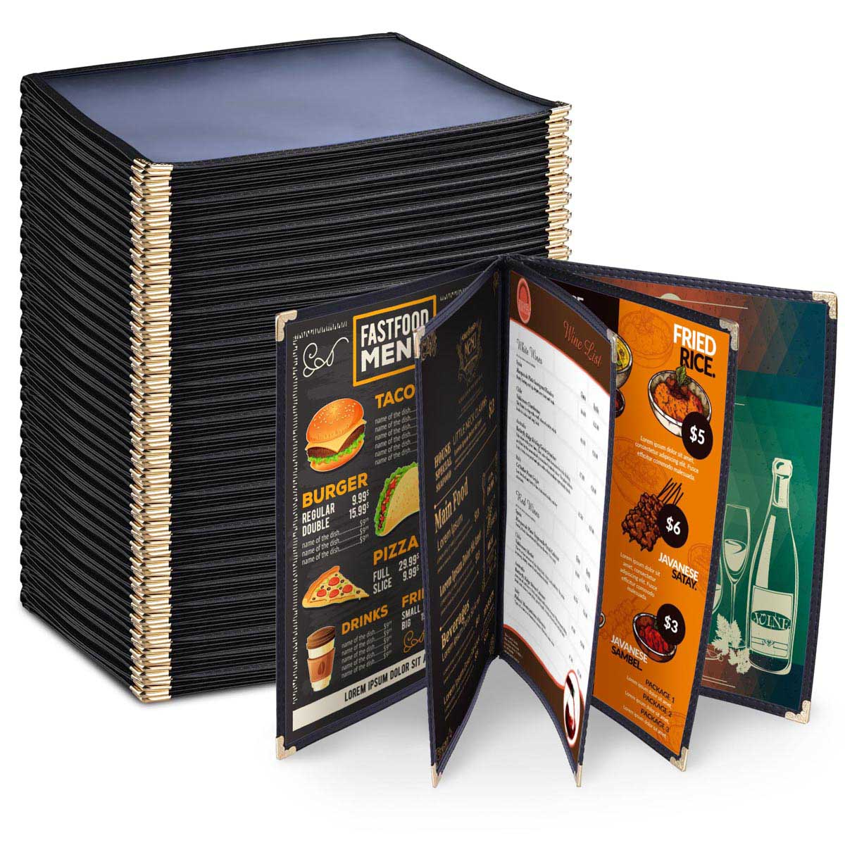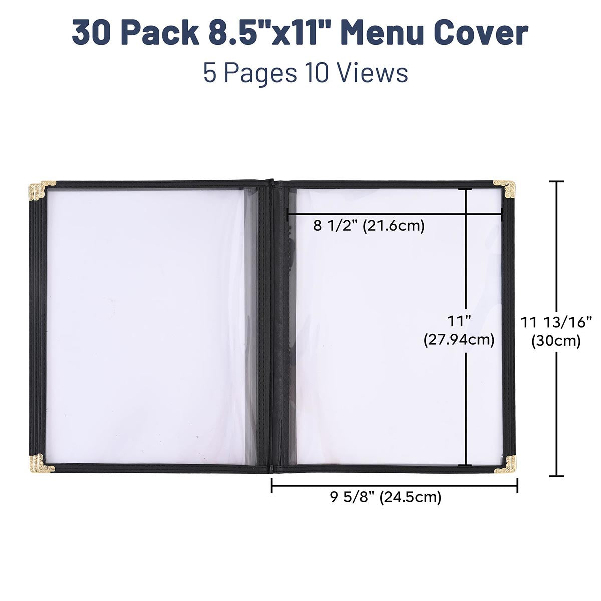 You are viewing 30pcs of brand new Standardized Commercial Grade Menu Covers/ Folders at a reasonable price. The clear protective menu covers are made with high-quality PVC, all side of them sewn with leatherette trim and decorated with elegant gold metal corners. Perfect for restaurants, hotels, cafes, porterhouses, nosheries, pubs, bars, etc. Come from professional menu cover manufacturer, more durable and exquisite than other cheap menu folders which made of tinpot plastic and rough leatherette. Safe and Environmental Friendly!